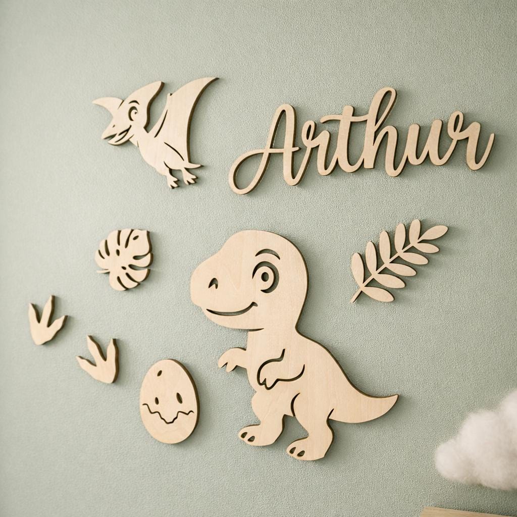 Décoration Murale Dinosaures en Bois - Kit 7 Pièces + Prénom Personnalisé (Option) - Déco Chambre Bébé & Garçon - Fixation Facile Incluse