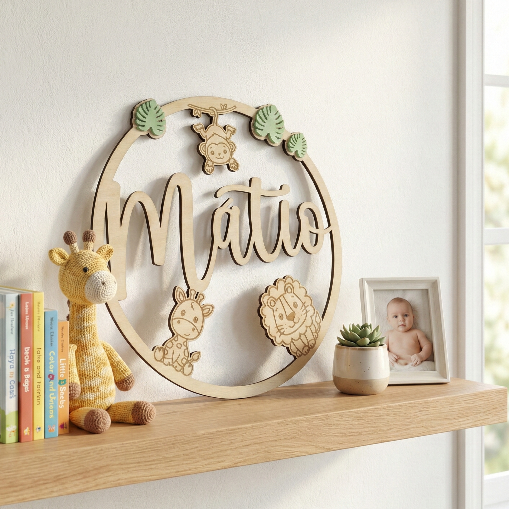 Voir produitDécouvrez notre cercle prénom en bois personnalisé sur le thème de la jungle, une décoration parfaite pour une chambre de bébé ou d'enfant !