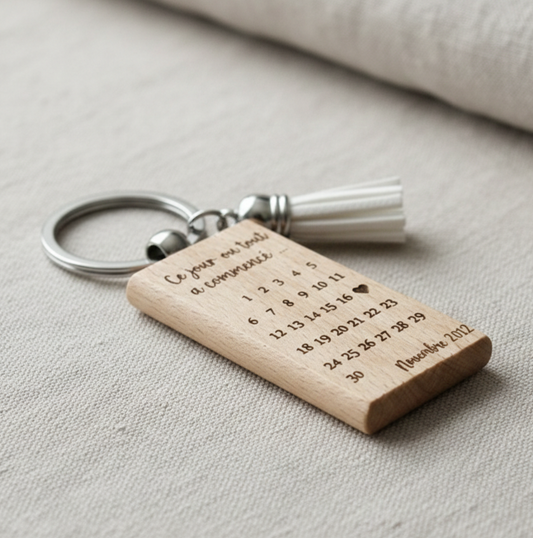 Porte-clés Calendrier Personnalisé en Bois - Date Gravée - Cadeau Couple pour Saint Valentin, Mariage, Baptême ou Naissance