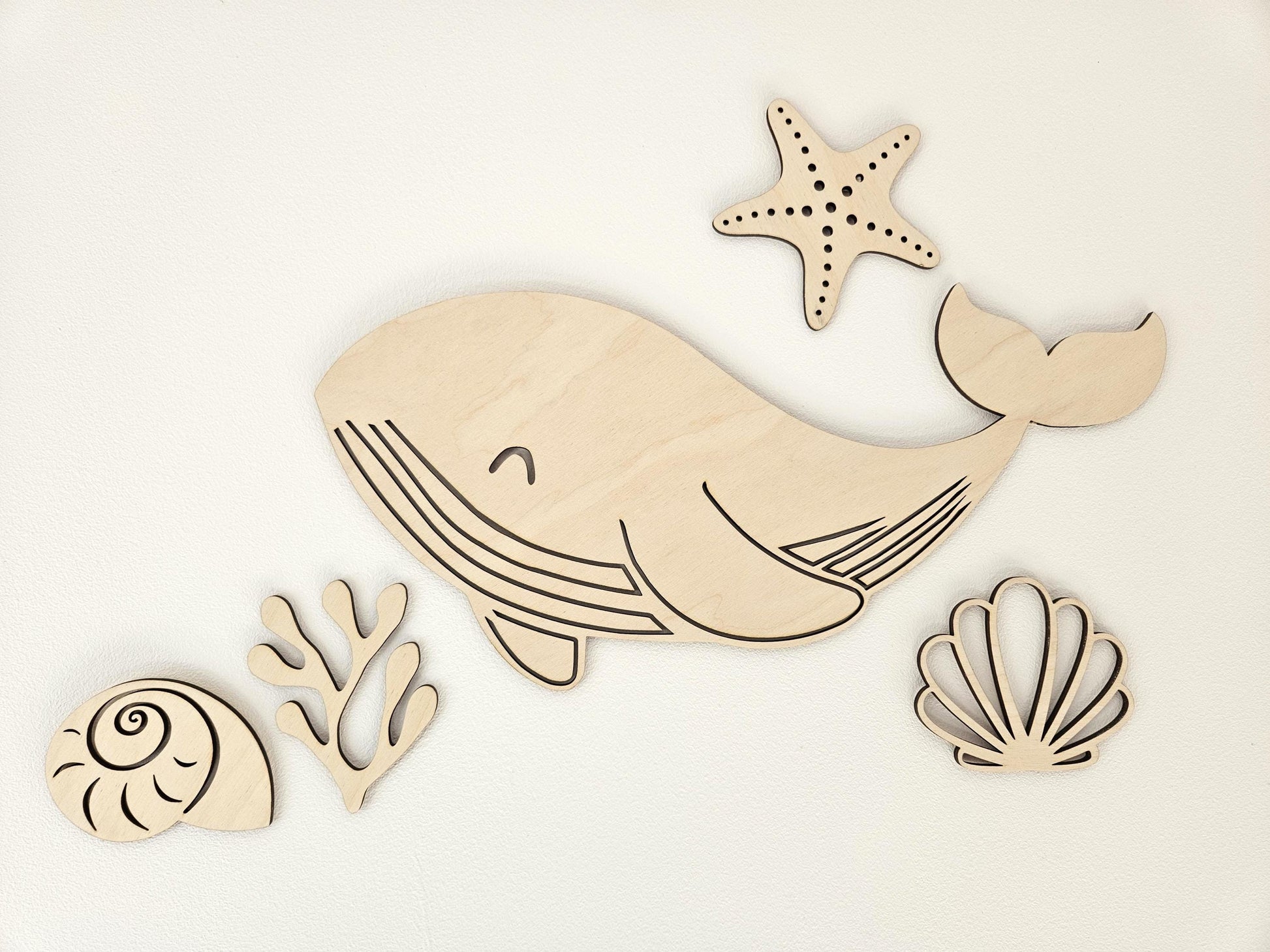 Cette jolie baleine, accompagnée d'autres éléments marins (Coquillage, escargot, étoile et plante), apporte une note de douceur et de raffinement.